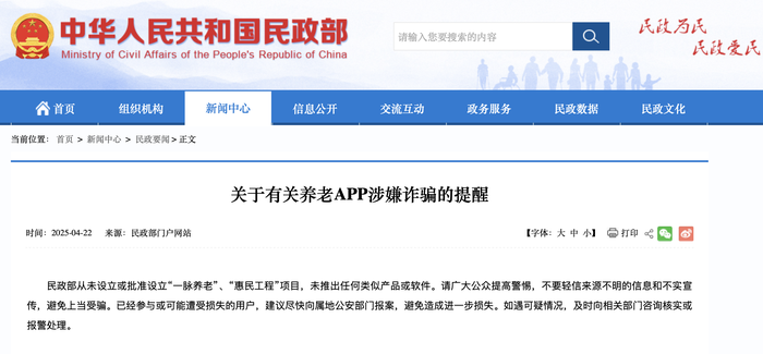 4月22日,民政部发布公告表示,民政部从未设立或批准设立“一脉养老”、“惠民工程”项目,未推出任何类似产品或软件。请广大公众提高警惕,不要轻信来源不明的信息和不实宣传易富配资,避免上当受骗。已经参与或可能遭受损失的用户,建议尽快向属地公安部门报案,避免造成进一步损失。如遇可疑情况,及时向相关部门咨询核实或报警处理。