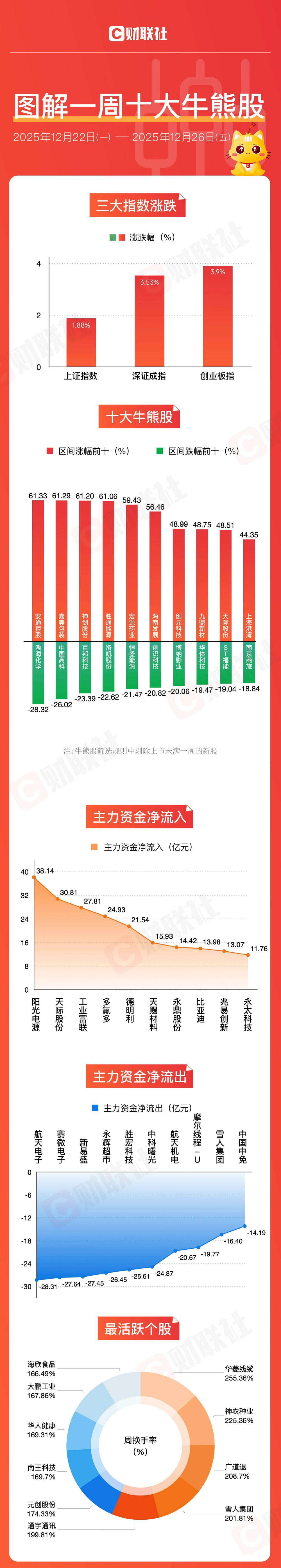 财联社12月28日讯靠谱配,本周A股三大指数震荡拉升,其中上证指数周涨1.88%,深成指周涨3.53%,创业板指周涨3.9%。本周电池、军工电子、工业金属板块涨幅居前,海南自贸区、商业航天概念股表现活跃。